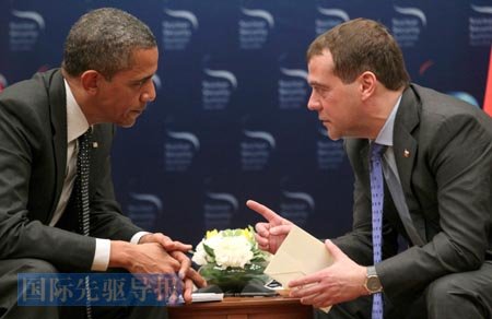 美俄总统在首尔核峰会上的私下对白,讨论的是两国在北约部署导弹防御体系、以及美俄有关举行新的核裁军谈判问题上的争端。 < "~k8:=4